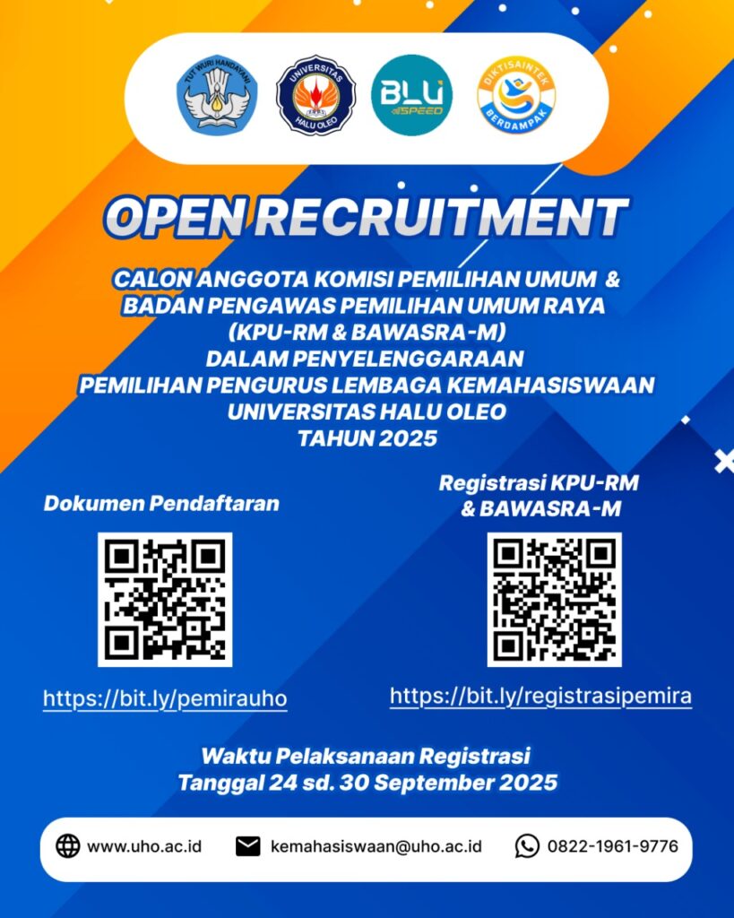 Pengumuman Open Recruitment Calon Anggota Komisi Pemilihan Umum dan Badan Pengawasan Pemilihan Umum Raya Mahasiswa (KPU-RM dan BAWASRA-M) Lingkup Universitas Halu Oleo Tahun 2025